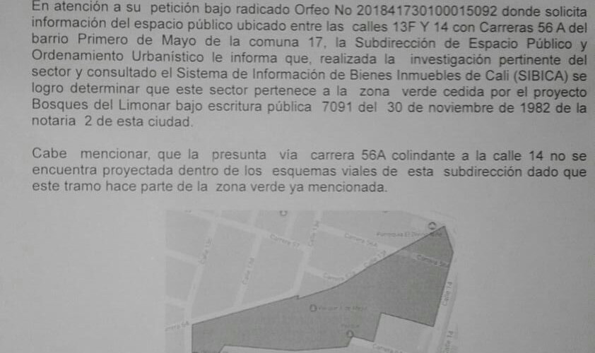 Teniendo en cuenta una recomendación de una anterior Asamblea, donde se planteaba la opción de abrir la prolongación de la carrera 56 A entre calles 13 F y 14, la Junta de Acción Comunal del barrio Primero de Mayo, se puso en la tarea de realizar esta labor. Inicialmente se solicitó a la Subdirección de Espacio Público y Ordenamiento Urbanístico, entidad encargada de este tipo de estudios, el uso del suelo de este sector de nuestro barrio. En respuesta del pasado 30 de enero de 2018, dicha entidad nos informó, que en el Sistema de Información de Bienes Inmuebles del municipio de Santiago de Cali, dicha zona está catalogada como una zona verde, razón por la cual no se puede convertir en una vía vehicular.